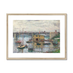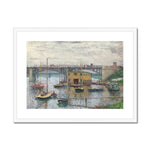 In the foreground, Monet employs his signature brushwork—short, rapid strokes that suggest ripples in the water, creating an impression of movement and reflecting the dim light of the overcast sky. Boats are moored along the riverbank, their forms loosely defined, indicating the casual realism Monet strived for. The reflections of these boats and the bridge stretch and distort in the river, enhancing the painting's sense of tranquility and the passage of time.