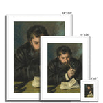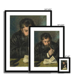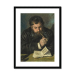 - Monet, sporting a full beard and long hair, is dressed in a dark coat that contrasts with the lightness of his face and background, drawing the viewer's focus to his features. The loose and fluid brushstrokes capture the texture of Monet's beard and hair, highlighting Renoir’s deft handling of paint.