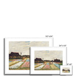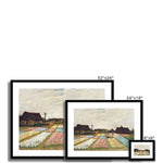 "Flower Beds in Holland," painted by Vincent van Gogh in 1883, is a breathtaking manifestation of Van Gogh's deep appreciation for rural life and nature’s vivid splendor. The canvas is a dazzling parade of color and light, capturing the expansive tulip fields of Holland, where vibrant rows of blooming flowers stretch across the scene. The flowers create a mesmerizing patchwork of red, yellow, purple, and pink hues, juxtaposed against the verdant green of their stems and the earthy tones of the soil between the rows.