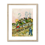 "Houses and Figure" by Vincent van Gogh is a quintessential example of the artist's post-impressionist style. The painting showcases a rural village scene, featuring a collection of humble houses with thatched or tiled roofs enveloped in an atmosphere of vivid colors and dynamic brushstrokes. At the center or near the foreground, a figure—likely a peasant or a farmer—appears, depicted in subtle but expressive detail.