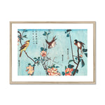 One of the central features is a pair of Japanese birds, likely varied types, possibly warblers or robins, perching on the branches of a blooming cherry tree, recognizable by its delicate, pale pink blossoms. Each bird is meticulously rendered, with attention to the intricate patterns on their feathers and the subtle gradation of colors. Their postures suggest a sense of vibrancy and life, as if captured in a fleeting moment.