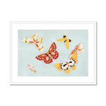 The butterflies are illustrated using vibrant hues and delicate brushstrokes, flitting against a stark, plain background which enhances their visual impact. The composition conveys a sense of movement and vitality, as each butterfly appears to float and flutter with organic spontaneity. This dynamic arrangement of butterflies across the canvas mirrors nature's diversity and ephemeral beauty, attributes celebrated in Japanese aesthetics.