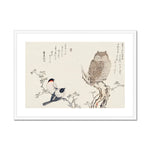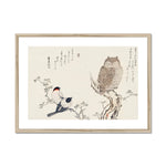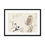 "Mimizuku Uso" (also known as "The Great Horned Owl and the Little Owl") is a celebrated woodblock print by the illustrious Japanese ukiyo-e artist, Utamaro Kitagawa. Utamaro is renowned for his mastery in bijin-ga, or "pictures of beautiful women," and his extraordinary ability to capture the subtle nuances of human expression and form. While his oeuvre is predominantly centered on human subjects, particularly women, "Mimizuku Uso" is an exquisite example of his foray into the natural world, delineating his versatility.