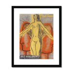 The painting "Naakte vrouw tussen twee van elkaar weg kijkende mannen hoofden" (translated: "Naked Woman Between Two Heads of Men Looking Away from Each Other") features a composition centered around a nude woman flanked by two male heads that are turned in opposite directions. The nude woman stands or sits in the middle of the composition, her body rendered with elegant and soft lines that highlight the natural curvatures and delicate features of the female form. The artist uses a subtle palette primarily consisting of muted earth tones, with occasional splashes of more vivid hues to accentuate certain parts of the body and surrounding elements.