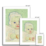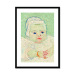 Marcelle's eyes, outlined with gentle yet expressive lines, exude a depth of curiosity and innocence, while her lips are subtly tinted with a delicate rosy hue. Van Gogh's application of color is both harmonious and expressive, with the baby's soft gown rendered in gentle, flowing strokes that enhance the delicate nature of the subject.