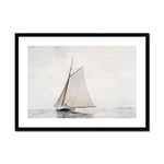 Two figures are prominently featured on the boat, one steering and the other tending to the sails. The sailboat cuts through a choppy sea, with whitecaps highlighting the turbulence of the ocean. The waves are rendered in dark blues and greens, topped with foamy crests, reflecting Homer's keen observational skills and mastery in capturing the ever-changing effects of water and light.
