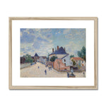 The composition presents a slight perspective view of a narrow street, elegantly framed by rustic stone houses with slightly sloping rooftops. The cobblestone path meanders through the village, leading the viewer’s eye towards the distant trees and sky. The texture of the buildings is meticulously rendered, capturing the weathered surfaces with a delicate interplay of light and shadows. Sisley's palette is characterized by soft, luminous colors that imbue the scene with a serene, almost nostalgic atmosphere. The gentle dabs of light blues, greens, and earth tones contrast beautifully against the more subdued hues of the stone structures, highlighting the integration of human habitation within the natural setting.