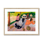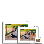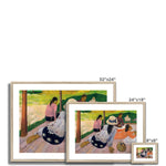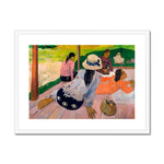 "The Siesta" by Paul Gauguin is a captivating example of the artist's ability to fuse vibrant color, expressive form, and evocative composition. The painting depicts a tranquil scene in which four Tahitian women are portrayed in various states of repose, set against a lush backdrop of tropical vegetation and rustic architecture. The women wear traditional Tahitian attire, accented with bright, patterned fabrics that contrast harmoniously with the natural surroundings.