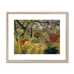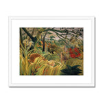 Henri Rousseau was a French post-impressionist painter known for his primitivist style. Despite having received little formal training, Rousseau developed a distinct and immediately recognizable style characterized by meticulous detail, flat spaces, and vivid, dreamlike scenes. "Tiger in a Tropical Storm" was his first jungle painting, notable because Rousseau had never been to a jungle; his inspiration came from visits to botanical gardens, illustrated books, and accounts from soldiers returning from abroad.