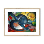 Marc's use of color is particularly noteworthy. Blue, often associated with spirituality and peace, imbues the blue cat with a serene and almost otherworldly quality. The yellow, vibrant and radiant, bestows upon the other cat an aura of liveliness and warmth. The interplay of these primary colors may also hint at complementary aspects of existence, resonating with Marc’s deeper exploration of the natural world’s harmony and chaos.