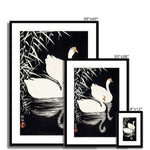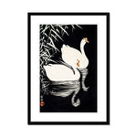 - "White Chinese Geese Swimming by Reeds" exemplifies Koson's mastery of capturing the serene beauty of nature, a hallmark of his kachō-e prints. This piece showcases his ability to render animals with intricate detail and authenticity while maintaining a composition steeped in tranquility and elegance.