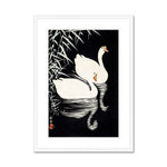 "White Chinese Geese Swimming by Reeds" by Ohara Koson is a delicate and serene woodblock print that captures the tranquil beauty of nature, a recurring theme in Japanese art. The composition centers on two elegant white geese gliding smoothly across a calm body of water. Their feathers are meticulously detailed, exhibiting Koson's keen eye for naturalistic texture and subtle color variation. The purity of their white plumage contrasts beautifully with the soft, muted tones of the water and the reeds.