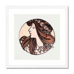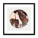 - Central Figure: At the heart of Mucha's composition lies a striking female figure, clad in elegant, flowing attire that encapsulates the quintessential Art Nouveau aesthetic. Her cascading hair, depicted in sensuous, swirling lines, is adorned with intricate floral motifs, seamlessly blending into the background and framing her countenance with ethereal grace.