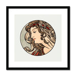 - Central Figure: At the heart of Mucha's composition lies a striking female figure, clad in elegant, flowing attire that encapsulates the quintessential Art Nouveau aesthetic. Her cascading hair, depicted in sensuous, swirling lines, is adorned with intricate floral motifs, seamlessly blending into the background and framing her countenance with ethereal grace.