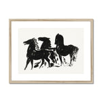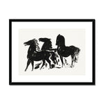 In this painting, the three horses dominate the composition, their powerful forms captured in a state of graceful motion and strength. The use of bold, sweeping lines and dark, solid colors conveys a sense of weight and presence. The horses' bodies are rendered with a dynamic energy, their black coats contrasted against a background of lighter hues, which might include earthy browns, greens, and possibly hints of blue, creating a natural setting that enhances the subjects' vitality.