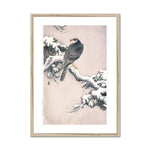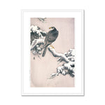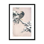 The pine bough, with its needles dusted in snow, creates a serene yet vivid environment. The snow is rendered in soft, almost impressionistic touches which contrast beautifully with the precise linearity of the pine needles. This juxtaposition of textures accentuates the delicate balance in nature that Koson so eloquently portrays.