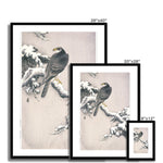 The artwork "Goshawk on Snow-covered Pine Bough" captures a majestic goshawk perched gracefully on a snow-laden pine bough. The painting exudes a sense of poised tranquility, characteristic of Koson's work. The goshawk, rendered in meticulous detail, stands out against the stark, white backdrop of freshly fallen snow. Its feathers are depicted with intricate strokes, varying from deep black to steely gray, showcasing Koson's deep attention to the textural nuances of the bird's plumage.
