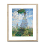"Madame Monet and Her Son" depicts Monet's wife, Camille Monet, and their son, Jean Monet, standing in a field on a sunny, windy day. Camille is the central figure, elegantly holding a green parasol to shade herself from the sun. Her dress is a light, flowing white, delicately catching the movement of the breeze. The parasol, along with Camille's veil, mirrors the movement of the grass and clouds, suggesting a unity between the figures and the natural surroundings.