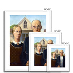 "American Gothic" is an iconic painting by the American artist Grant Wood, created in 1930. The painting depicts two solemn figures positioned in front of a white house designed in the Carpenter Gothic architectural style. The figures are a farmer, holding a pitchfork, and a woman in a colonial print apron reminiscent of both the 19th-century American frontier and early 20th-century rural life.