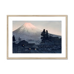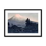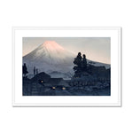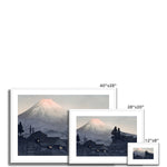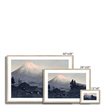 In this serene and meticulously crafted composition, Mount Fuji is the mesmerizing focal point, emanating a quiet grandeur. The towering mountain, with its iconic snow-capped peak, dominates the mid-ground of the print, creating a sense of both monumental scale and tranquil beauty. The mountain is surrounded by arresting blue and green hues, depicting the lush forestry and intricate contours of the landscape.