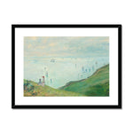 "Cliffs at Pourville" depicts a serene yet dramatic coastal landscape in Pourville-sur-Mer, a small village in the Normandy region of France. The composition is dominated by expansive, rugged cliffs that rise majestically from the shoreline. These cliffs, rendered in various tones of browns, ochres, and subtle greens, exhibit Monet's preoccupation with capturing the interplay of light and texture on natural surfaces.