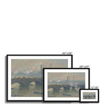 The composition is dominated by a soft, muted palette of grays, blues, and lilacs, evocative of a misty, overcast day in London. The bridge itself is almost spectral, emerging hazily from the mist, with its arches subtly rendered to convey depth and solidity amid the vaporous surroundings. The atmospheric conditions dissolve the form of the bridge, blending it seamlessly into the sky and water, showcasing Monet's preoccupation with capturing the impermanence of the moment.