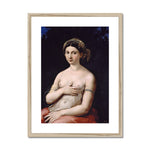 The subject, Margherita, is portrayed in a semi-nude state, seated against a dark, neutral background that effectively highlights her form. She wears a delicate headscarf adorned with pearls and a thin, transparent piece of fabric draped around her shoulders, teasingly leaving her upper body mostly exposed. Her right hand rests gently over her left breast, while her left arm, adorned with a band bearing the artist’s name ("Raphael Urbinas"), wraps sensuously around her waist. The skin’s luminosity and texture are meticulously rendered, exemplifying Raphael’s unrivaled skill in depicting the human form.