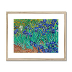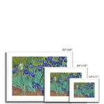"Irises," painted by Vincent van Gogh in 1889, is a masterful depiction of vibrant, blooming iris flowers rendered in van Gogh's distinctive post-Impressionist style. The painting captures a lush cluster of irises set against a background of verdant green leaves and soil, with their petals displaying a dynamic interplay of blues, violets, and whites. The brushwork is characteristic of van Gogh’s expressive technique, with thick, swirling strokes that give the flowers and foliage a palpable sense of movement and life. Each iris flower is meticulously detailed, showcasing the artist's keen observation and deep appreciation of nature's forms.