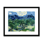 "Olive Trees with the Alpilles in the Background" is one of Vincent van Gogh's vibrant and expressive landscape paintings, completed in 1889 during his stay at the asylum of Saint-Paul-de-Mausole in Saint-Rémy-de-Provence, France. The canvas bursts with dynamic brushstrokes and striking color contrasts. The depiction of the olive trees shows a complex interplay of swirling, undulating lines which seem to convey the trees' resilience and vitality. The Alpilles mountains, serving as a backdrop, are delineated with sweeping curves and bold outlines, giving a sense of the craggy, majestic terrain. The sky is animated with rhythmic, turbulent patterns of blues and whites, enhancing the emotional intensity of the scene.