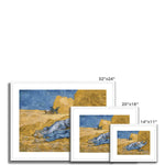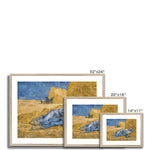 In "The Siesta", Van Gogh uses his distinctive, bold brushstrokes and a vivid color palette to recreate the scene. The heavy, swirling strokes of golden yellow animate the mound of wheat, contrasting with the serene blues and purples of the sleeping figures' clothing. The shadows cast by the nearby haystacks are painted in deep, warm tones, punctuating the scene’s intensity with dramatic emphasis.