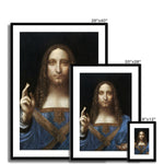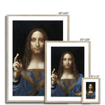 At first glance, "Salvator Mundi" is a striking and serene portrayal of Christ as the Savior of the World. The painting captures a frontal, half-length figure of Christ dressed in luxurious, rich robes rendered with Leonardo's characteristic attention to intricate details. He is shown with his right hand raised in a gesture of benediction, while his left hand holds a transparent, crystalline orb, symbolizing his role as the master of the cosmos.